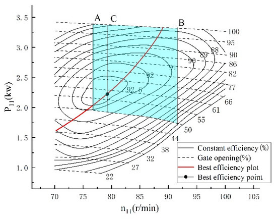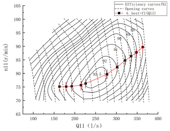 According to the Hill diagram of the pump-turbine (see Figure 9), when the unit discharge Q11 is constant, the efficiency η will vary with n11, so that the best efficiency point corresponding to the pump-turbine to each unit speed n11 can be obtained, which is marked as the solid point in Figure 9, which is connected to obtain the optimal efficiency curve of pump-turbine: , substituted into Equation (2) to receive the maximum output curve of pump-turbine: ;