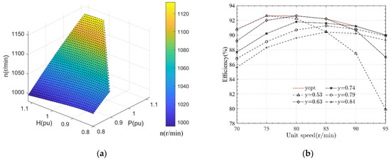 Through the elaboration of the above process, Figure 10 shows the operation curve fitting processing results of a variable speed pump-turbine under a certain head and power range domain. Figure 10a can be seen as a look-up table, and the corresponding efficiency and opening values are shown in Figure 10b, which shows the efficiency increase during the variable-speed process, especially at high unit speed, i.e., low head conditions, where the efficiency increase is more obvious.