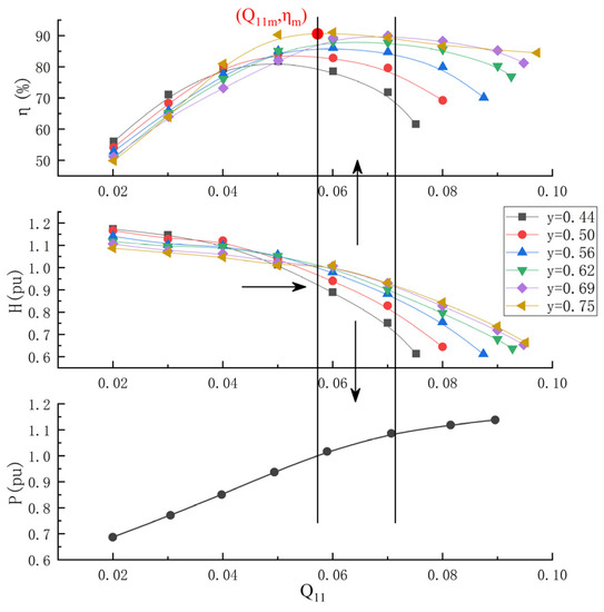 Similar to the generation mode, the process of load optimization calculation in pump mode is also based on the characteristic curve of the model test, as shown in Figure 11. The flow of the pump-turbine has a certain limiting relationship with the head and efficiency when the input power changes. First, the head of the prototype unit should be determined from the model unit according to the law of similarity [40], and then the efficiency and flow corresponding to different openings at the rated head can be found according to the arrows drawn in Figure 11. It is observed that the efficiency of the pump-turbine is a set of curves related to the opening at the rated head, and a maximum efficiency point can be found, recording the point (Q11m, ηm), and the optimal guide vane opening value is then obtained.