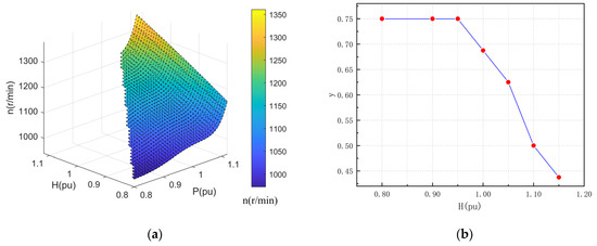 We then fitted and calculated for a certain head interval; the calculation results are shown in Figure 12, where Figure 12a is the speed calculation result and Figure 12b is the obtained guide vane determination curve.