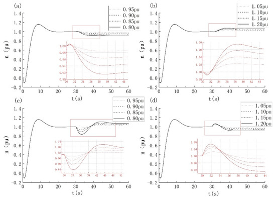 Applying the load optimization process, the simulation results of the regulating system are shown in Figure 13. Figure 13a,b shows the dynamic speed response curves, as the power setting value changes at 30 s, and Figure 13c,d shows the response curves of the head variation. It can be noticed that the operating point of the unit has a corresponding dynamic fluctuation as the power and head of the variable-speed unit change. Under the same initial and changing range conditions, the head variation has a greater impact on the control system. In addition, the adjustment system requires a longer stability time, which illustrates that the variable-speed hydroelectric unit has high requirements for the accuracy of the head measurement, and the setting of the governor dead zone should be considered. Take the increase of speed as an example: with the increase of power signal, the speed of the turbine increases. The rate of the turbine speed in Figure 13b is 1.925%, 3.405%, 4.803%, and 6.132%, respectively. Similarly, in the case of reduced head, the rate of increase is 2.192%, 3.953%, 5.642%, and 7.243%. The variation of the regulation system has less volatility at different power variations. Considering the actual head range and output limitation of the hydropower station, the speed range can be further revised.