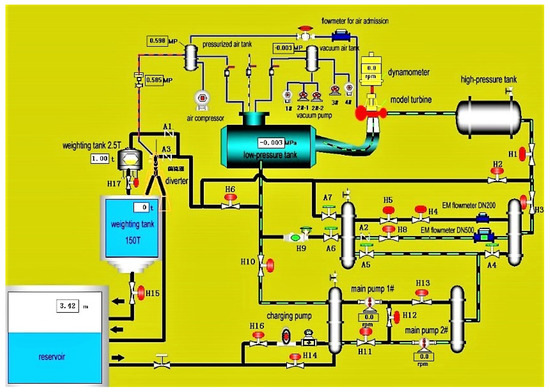 The experimental research is carried out on the Universal Test Rig for Hydraulic Machinery (UTR-HM). The UTR-HM is a closed-circuit system, with the capacity of testing head >100 m and discharge >2.0 m3/s [41]. As shown in Figure 14, the test system consists of a low-pressure tank, high-pressure tank, main pumps, dynamometer, electromagnetic flowmeter, and model turbine. The model turbine is installed between the high-pressure and low-pressure tanks, coupled with the speed regulating dynamometer. In order to adjust the system pressure, a pressure regulating system which provides pressurized air, vacuumed air, and ambient air is connected to the low-pressure tank. High precision transducers and systems are adopted to acquire data, and pump-turbine model tests generally take the best operating point for uncertainty analysis. The relative error corresponding to the uncertainty of this test bench is less than ±0.2%.