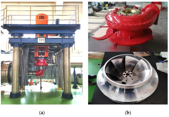 TP1 Hydraulic turbine model test bench: (a) test bench; (b) view of the model of the tested machine and its runner.