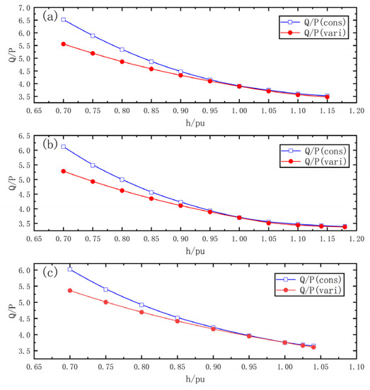 Figure 17 shows the discharge-power ratio of conventional units and variable-speed units. It is observed that the discharge-power ratio of the two types of units overlap at the design head, while the difference at the left end is large, which indicates that the efficiency of the variable-speed pump-turbine is improved, resulting in the operation process producing less discharge with the same power (about 15% less discharge at 0.7 head) than the conventional unit at different heads, and it is applicable to various guide vane openings. It should be noted that for high head conditions, the effect of changing the speed to track the high efficiency of the unit is not obvious (two curves almost coincide at high head). Therefore, corresponding parameter requirements should be set to avoid frequent state changes of the unit under high head conditions.