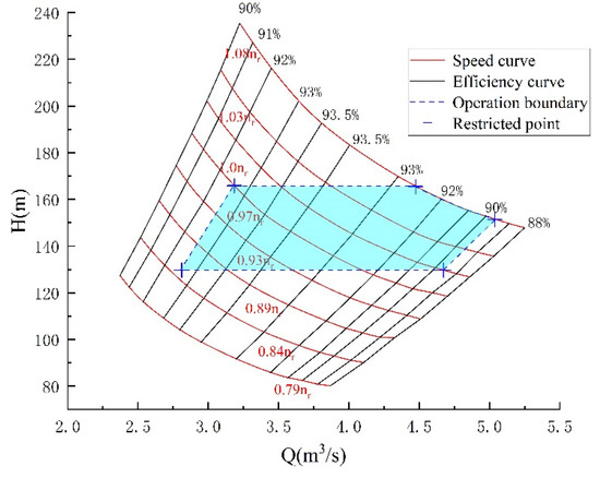 These research results have enabled variable-speed hydropower plants to store great quantities of immediately available potential electricity, providing better flexibility and stability for the power system and grid [31]. In general, for the research of variable-speed hydropower units, few papers have focused directly on the variable-speed regulation capability based on load optimization process from the perspective of pump-turbines, and research on the regulation system of variable-speed units is very limited. Moreover, there is no practical engineering application of a variable-speed pumped storage unit in China. A large gap in the empirical parameter identification of a variable-speed unit is yet to be explored. The load optimization process based on characteristic curves proposed in this paper has high reliability and a wide range of applications. It can provide a modelling basis for further parameter identification and control method improvement of variable-speed units. For some hydropower stations that can be refitted, this method can be used to predict the operation effect and evaluate the transformation cost. Therefore, a comprehensive study of this topic is meaningful and urgently needed.