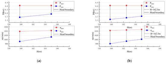 Figure 20 shows the prototype of the working curves converted from the model test. Regarding the off-design behavior of the pump-turbine, the minimum speed is limited by the saddle-shaped characteristic of the pump flow-head, while the maximum speed is determined by the maximum input power and risk of cavitation performance. The intercepting head range of 161.2–166.4 m is used to analyze variable-speed characteristics such as input power and speed. The blue area is the ideal operation area of pumping mode (optimal operating area in fixed opening regulating mode, a larger regulation range can be pursued by adjusting the opening signal). The unit operating in this area has a higher efficiency and achievable variation range of input power. The speed variation range is 3.52–4.66%, and the power amplitude of adjustment can reach 18.4–23.8%. Therefore, the pump-turbine with variable-speed operation in pump mode has a wider receiving range of input power, which can meet the power demand of the grid and maintain the optimal operation of the unit itself, and has a great performance promotion compared to the conventional fixed-speed units.