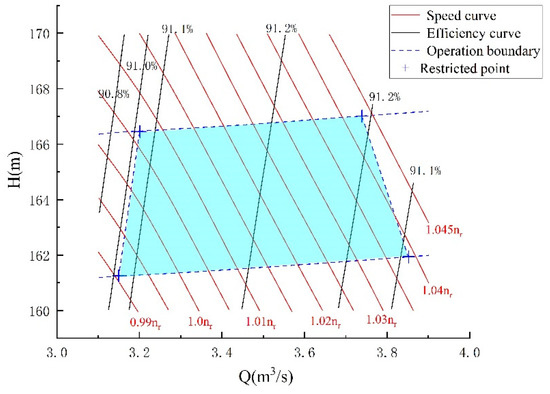 The load optimization process is a procedure of adjusting the operating point according to the criterion of maximum efficiency in pump and generation mode. This section is based on the operating curves obtained from the model test (the parameters and details of the pump-turbine and the model test are described in Section 5). The specific steps for the optimization of speed and opening under two operating modes are mainly demonstrated below.