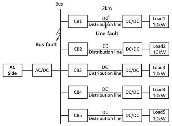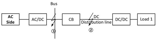Figure 1 shows a simple LVDC distribution system. It consists of an AC/DC converter to connect to the AC side, LVDC distribution lines, LVDC bus, loads, DC/DC converter connected to the load, and circuit breaker (CB). This paper considers the LVDC distribution system as an ungrounded system. The fault type of LVDC distribution system can be classified into the pole-to-pole fault and the pole-to-ground fault. In an ungrounded system, the detection of fault current at the pole-to-ground fault is difficult and hence this paper only considers the pole-to-pole fault. In Figure 1, each number represents a possible fault sections. The meaning of each number is as follows:
