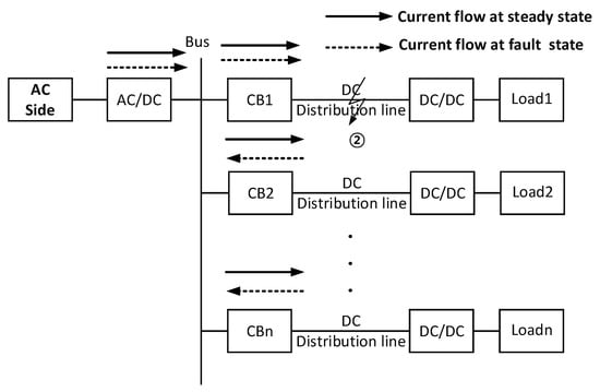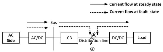 Figure 2 compares the flows of currents at steady state and fault state when the fault occurs on the LVDC bus (fault section ①). Under steady state, current flows to the load. However, in the fault state, the current in the opposite direction to the steady state will flow due to the discharge of the capacitor of the DC/DC converter connected to load. In addition, this current will flow through the LVDC distribution line. Figure 3 compares the current flow in the normal state and in the fault section ②. The capacitor discharge current of the DC/DC converter will flow to the fault point in the line, and the capacitor discharge current of the AC/DC converter will flow in the CB. Therefore, the direction of current flow in the CB is the same in the normal and fault states. Therefore, a current of the same polarity in the steady state will be measured in the CB. Because the current by the capacitor discharge of AC/DC converter will flow in the CB, the direction of current flow is the same in the normal and fault states. Therefore, a current of the same polarity in the steady state will be measured. The current flow in Figure 3 depends on where the distribution line fault occurs. If a fault occurs in the distribution line at the CB, the situation is too similar to that in Figure 2. However, this is very specific case and this paper does not consider this situation.
