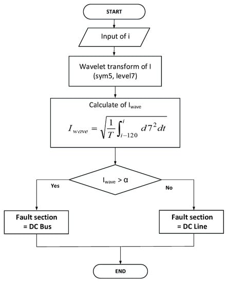 Because the calculation result of Equation (3) uses the detail components, the high frequency components will be included. In Section 2, we analyze the attenuation of the high-frequency components in LVDC line fault. Therefore, we can expect that the calculation value of Equation (3) in LVDC bus fault is larger than that in LVDC line fault. In the proposed algorithm of this paper, we utilize the result of this analysis. In the algorithm, α is a threshold value to distinguish the fault section. If it is larger than this value, it is judged as LVDC bus fault; if it is smaller than this value, it is judged as LVDC line fault.