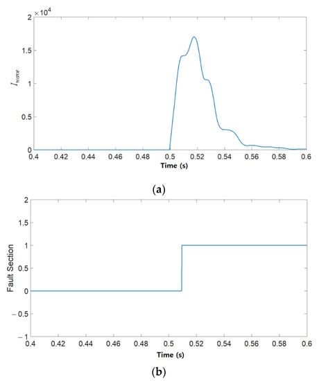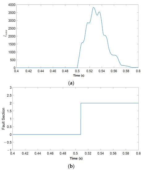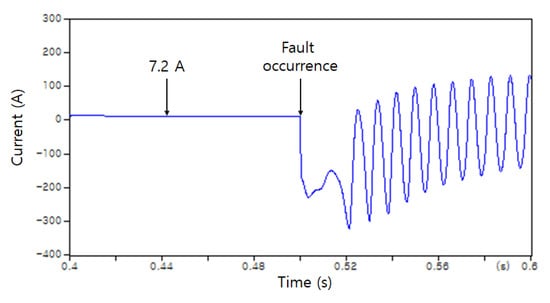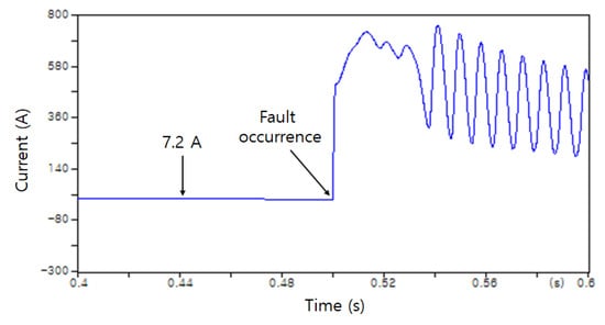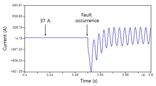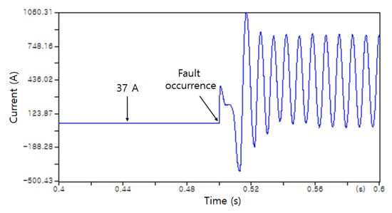 Figure 16 and Figure 17 present the current flowing through the CB in the actual distribution system, which is a representative case of each fault section. Figure 16 is a case of bus fault; it can be seen that the (−) value is observed after the fault occurrence in 0.5 s. Figure 17 shows the case of line fault; it can be seen that the (+) value is observed after the fault occurrence. This is consistent with the analysis results in Section 2. In other cases, the change in fault current polarity is consistent with the results of the analysis in Section 2.