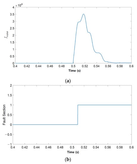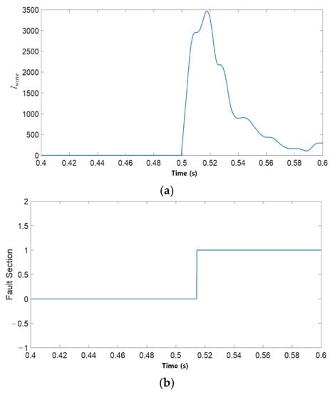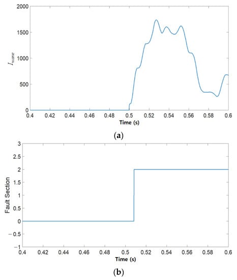 Simulation results of Case 7: (a) Calculation results of Iwave (b) Fault section estimation.