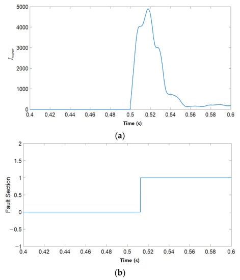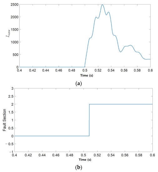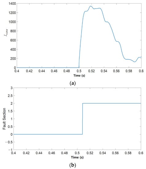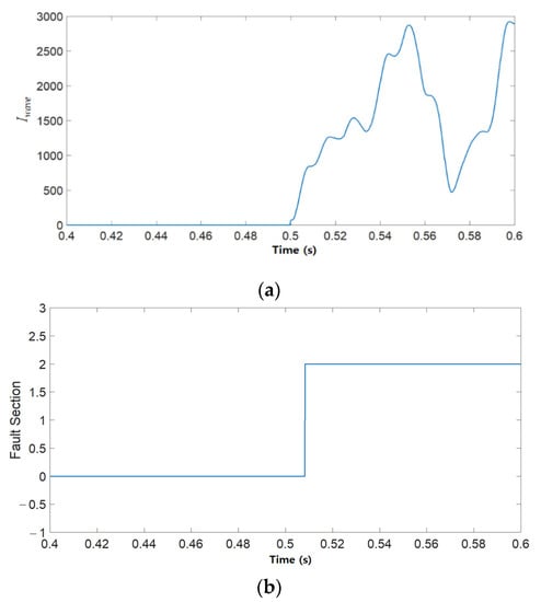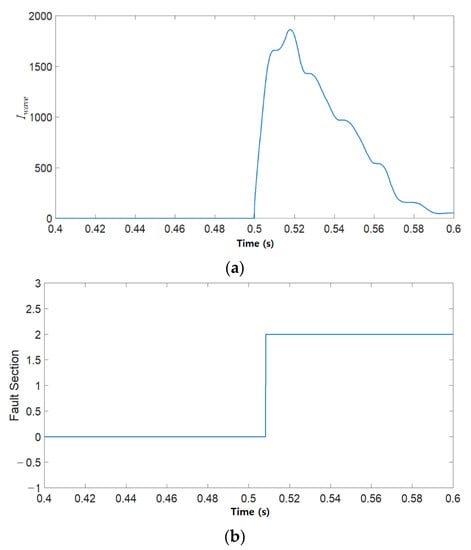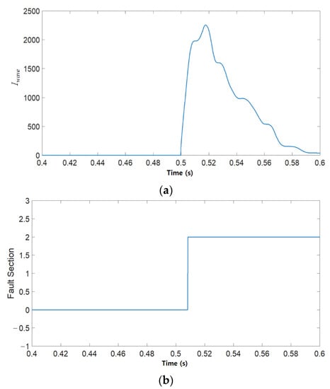 Figure 9, Figure 10, Figure 11, Figure 12, Figure 13 and Figure 14 show the calculation result of Iwave by Equation (2) and the result of the fault section estimation accordingly in Cases 1–6. Figure 9 and Figure 10 show the results at bus fault. From Figure 9a and Figure 10a, it can be seen that the calculation result of Iwave is larger than the threshold value of 7000. Therefore, the simulation result of the fault section estimation presents the ‘1′ as the bus fault by the proposed algorithm. Figure 10, Figure 11, Figure 12, Figure 13 and Figure 14 show the results at the line faults. The various simulations according to the fault resistance and fault locations are performed. From each result, it can be seen that the calculation result of Iwave shows a value of 4500 or less, which is smaller than the threshold value of 7000. Therefore, it can be seen that the results of fault section estimation present ‘2′ because it is determined as a line fault by the proposed algorithm.