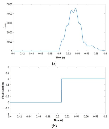 Simulation results of Case 5: (a) Calculation results of Iwave (b) Fault section estimation.