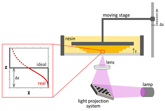 Schematic showing of a bottom-up vat photopolymerization 3D printer. Each printed layer, with a thickness of Δz, was characterized by a non-constant monomer-to-polymer conversion χ, which showing a sigmoidal profile (red), and varies from the ideal square profile (black). Reprinted with permission from Ref. [53]. Copyright 2016 by the authors and licensee MDPI, Basel, Switzerland.