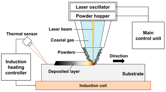 Direct Energy Deposition (DED), an additive manufacturing method to print metals, alloys and functional components, is a layer-by-layer (LBL) AM process [58,59]. Theoretically, in distinction to the powder bed fusion methods where a powder bed is selectively melted, direct energy deposition is operated using concurrently supplied powder feeding of wire and a focused energy source such as such as Nd: YAG or CO2, or other energy sources. In this printing, a melt pool is designed on the substrate surface or previous coated layer by using a relatively high-energy laser, and powder is propelled through the laser and into the melt pool. All layers are produced track by track via a user-defined tool path. Figure 6 displays a diagram of the DED technique for the molten pool, where the substrate and powder are melted. This technique generates less waste, allows for production of bigger parts, modification/repair of existing parts, and enhaces speed of manufacturing of new parts. However, it also means that no support is possible, so there are more stringent restrictions on design.