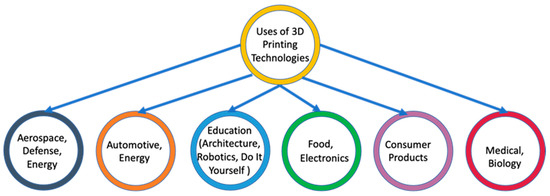 Lately, there has been a lot of publicity about the potential of what can be accomplished by adopting 3D printing as one of the key additive manufacturing technologies [68,69,70]. 3D printing technologies have developed significantly in recent years and can now execute essential roles in many applications, such as manufacturing [71], automobile [72], aerospace [73], defense [74], medicine [75], energy [76], architecture [77], construction [78], food [79], cosmetic [80], fashion [81], art [82,83], supply chain [84], prosthetics [85] and even fighting against coronavirus disease in 2019 (COVID-19) [86] (Figure 8). Over a long period of time, the main issue with 3D printing techniques was that it entailed high access costs, which prevents its lucrative employment in mass-manufacturing [87]. However, as the commercial market for 3D printed materials and parts has shown some of the fastest growth within the manufacturing sector in recent times, it has been discovered that this issue is finally going away [88].