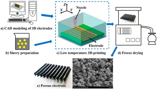 Manufacture of LiFePO4 (LFP) electrode by low temperature direct writing (LTDW). (a) Computer-added design (CAD) modeling of 3D electrodes, (b) slurry making, (c) low temperature direct writing, (d) freeze-drying step, (e) obtained porous electrodes. Reprinted with permission from Ref. [93], Copyright 2017 by the authors and licensee MDPI, Basel, Switzerland.