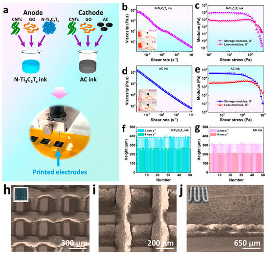 Description of a 3D printing method, rheological properties of inks, and microstructure of the woodpile-shaped electrodes. (a) Illustration of the printing process of the 3D-printed cathode and anode. (b) Apparent viscosity as a function of shear rate for the N-Ti3C2Tx ink. (c) Storage modulus (G′) and loss modulus (G′′) as a function of the shear stress for the N-Ti3C2Tx ink. (d) Apparent viscosity as a function of shear rate for the AC ink. (e) Storage modulus (G′) and loss modulus (G′′) as a function of the shear stress for the AC ink. (f,g) Height distribution of the 3D-printed (f) N-Ti3C2Tx (M8T1) and (g) AC lines with changed speeds. (h–j) SEM micrographs of the (h,i) top analysis and (j) side analysis of the 3D-printed N-Ti3C2Tx electrode. The inset in (h) displays a real photograph of the woodpile electrode. The inset in (j) shows a low-magnification SEM image of the woodpile electrode. Reprinted with permission from Ref. [94], Copyright 2020 by the American Chemical Society.