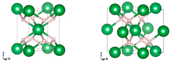 Simulation image of a crystal unit cell for ϵ-ZrH2 (left) and δ-ZrH1.5 (right). Zirconium atoms are colored green (large), and hydrogen atoms are rose (small). Reprinted with permission from Ref. [111]. Copyright 2021 by the authors and licensee MDPI, Basel, Switzerland.