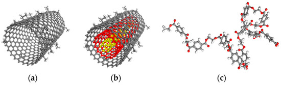 Molecular models of (a) (23, 0) single-walled carbon nanotubes (SWNT), (b) (23, 0), (14, 0), (5, 0) multi-walled carbon nanotubes (MWNT), and (c) polyethylene terephthalate (PET) chain. Reprinted with permission from Ref. [124]. Copyright 2021 by the authors and licensee MDPI, Basel, Switzerland.