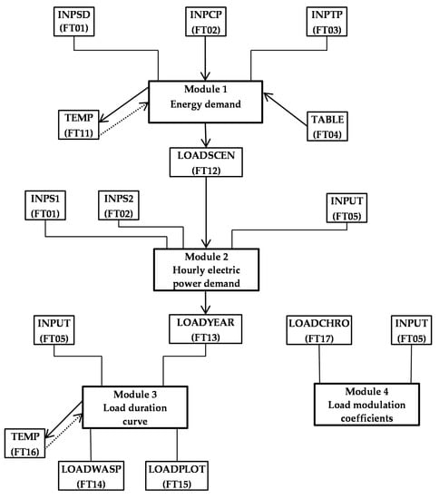 Module 2 (Hourly Electric Power Demand) uses the total annual demand of electricity for each sector (contained in file “LOADSCEN”) to determine the total electric power demand for each hour of the year or, in other words, the hourly electric load which is imposed on the power system under consideration. During its execution, this module creates a file (FT13: “LOADYEAR”) to be used by Module 3.