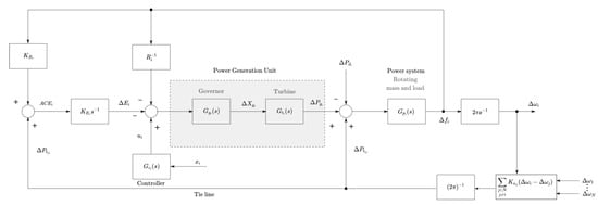 where —the state vector; —the adjacent area state vector of ; —the control vector; —the vector of load disturbance; , , , and —state variables, i.e., the incremental deviation in frequency (Hz), generator output (p.u. MW), governor valve position (p.u. MW), integral control and rotor angle, respectively; , , , and are the power system and machines gain, speed regulation coefficient (p.u. MW ), integral control gain, and frequency bias factor, respectively; , , and are the time constants in (sec) of power system and machines, turbine and governor, respectively; is the interconnection tie line gain between area i and . The dimensions of the i-th area matrices in (9) are , , , .