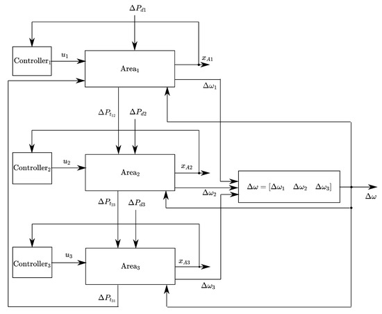 The block diagram of the considered in the paper control system for three-area power generation system is given in Figure 2. In this paper, we consider a case of individual control system for each area. The control in each area is based on measurements in this area only, plus agglomerated information about the frequency deviations.