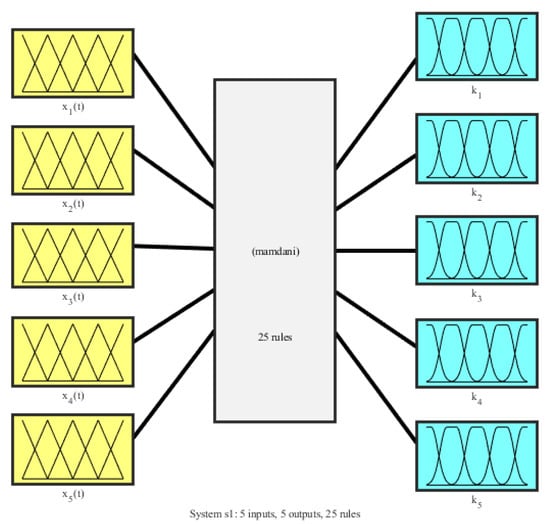 The fuzzy controller provides us with 5 different outputs, ; . These outputs, , are gains of the controller, i.e.,