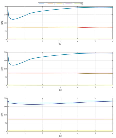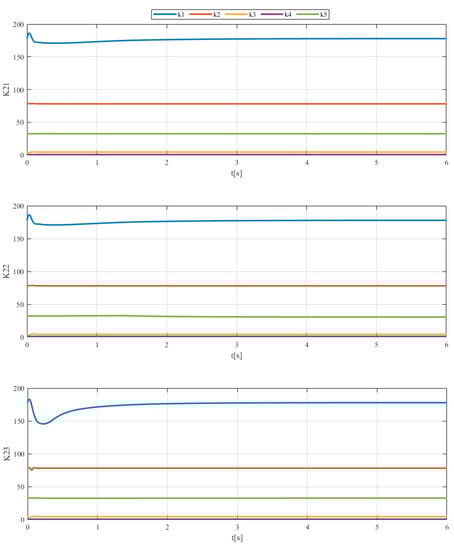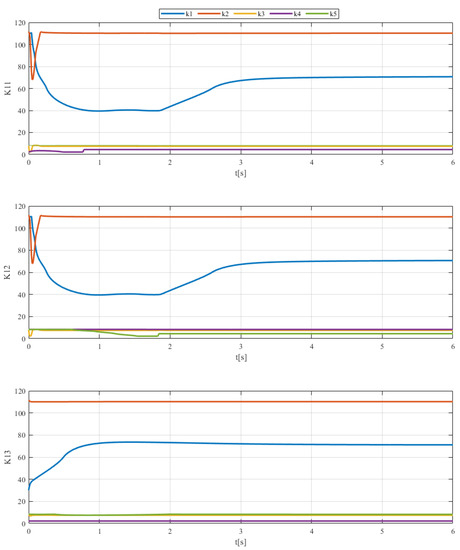 The differences in the performance and energy consumption can be explained by the significant differences in the controller gains between LQR and FLC algorithms (see Table 3, Table 4 and Table 5, and Figure 7, Figure 8 and Figure 9). The gains values and their range of changes during adaptation of FLC controller are much higher than the optimal values of the LQR controller. Thus, we get a very strong control signal.