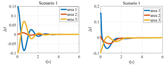 The time responses of with LQR (left figure) and fuzzy controller (right figure) for different areas—scenario 1.
