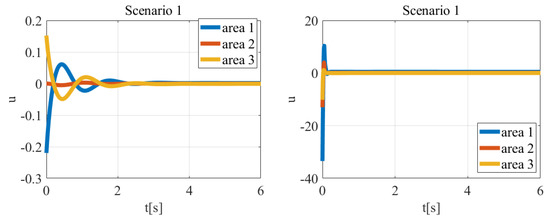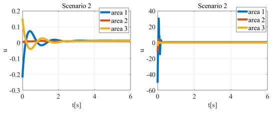 Control signals with LQR (left figure) and fuzzy controller (right figure) for different areas—scenario 1.