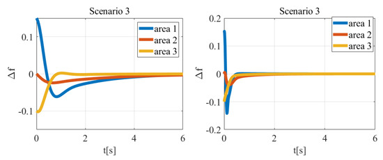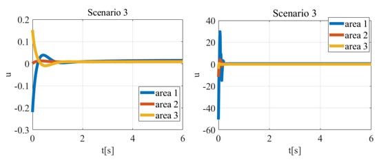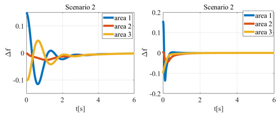 In the first simulation scenario, the system responded to the non-zero initial conditions. In the case of the LQR control strategy, areas 1 and 3 had similar quality indices, while area 2 had the smallest maximum errors, and area 3 had the biggest overshoot. The energy generated by the controller was biggest in area 1 and smallest in area 2 (ISV index). In the case of the FLC control strategy, the quality indexes, and energy generated by the controller, were similar for all areas. In terms of integral indexes (IAE, ITAE, ISV), the LFC control strategy was worse than the LQR strategy—the biggest difference was in case of area 1. Furthermore, in all areas there was visible large overshoot.