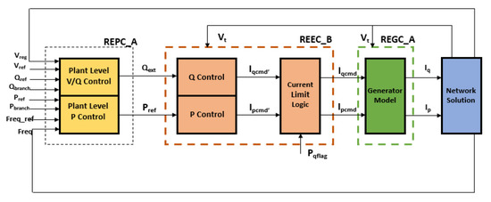The Renewable Energy Generator/Converter module (REGC_A) is simply a high bandwidth current regulator. This part of the model injects the real and reactive components of the inverter currents into external network during the network solution in response to real and reactive current commands from electrical control model. The Renewable Energy Electrical Control module (REEC_B) consists of a local active power control and a local reactive power control. It generates the active and reactive current command signals which will then be given to generator converter model which injects real and reactive currents into the external network. As per the LVRT regulation requirements, the value of a user-specified flag denoted by PQ flag can be set, thus choosing between active power priority and reactive power priority. Renewable Energy Plant Control module (REPC_A) is an optional model depending on whether a plant level control is implemented or not. In the study presented here, this block is not implemented.
