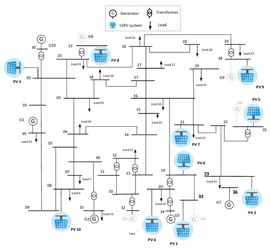 In this research work, to realize different solar PV penetration levels, the New England System is modified by replacing some of the synchronous generators with grid code compliant WECC large-scale PV system models. The generators numbered 3, 4, 6, 8 and 9 had been displaced by adding ten PV models at bus numbers 33, 23, 2, 20, 35, 19, 21, 37, 38 and 8, respectively, by increasing penetration level up to 60% in steps of 10%. The placement of solar PV systems was based on voltage sensitivity analysis and existing transmission line constraints. These buses are identified by applying three-phase faults at each of the buses and observing corresponding voltage heat map. From the heat map, the buses which resulted in higher voltage dips at the remaining nodes of the system due to the applied fault are considered as weak buses and are used for placing PV systems. The single line diagram of modified solar PV integrated 50 Hz study system is shown in Figure 2.