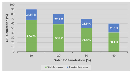 As mentioned in Section 3, a vast range of operating conditions are created by varying PV penetration levels from 0 to 40% and by applying 3-phase faults at all the 39 buses of the test system by varying voltage dips and fault durations. For a given contingency, if the value of calculated TSI is less than 10%, network is considered transiently unstable. A total of 312 fault cases are simulated for a single generation mix of the test system and number of stable and unstable cases identified using TSI is expressed as a percentage of total fault cases. The summary of obtained results is shown in Figure 3. It can be clearly observed from the chart that number of stable cases is reduced with rise in PV penetration level, i.e., when solar PV penetration in the system increases, transient stability is worsened.