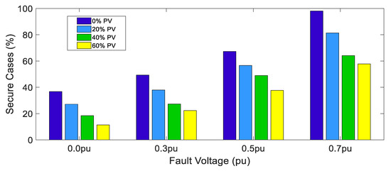 As per NERC contingency criteria, buses with a VSI greater than 0.25 during transient period following a fault are considered as severe buses. In this analysis, various fault conditions as given in Table 1 for various system operating conditions are simulated and based on the value of VSI calculated using Equation (3); secure buses are identified in order to assess dynamic security of the test system. For each PV penetration level varying from 0–60% and for each retained fault voltage conditions (0–0.7 pu), the number of secure cases are expressed as a percentage of the total cases studied. Results obtained are indicated in Figure 4. The chart clearly shows how number of secure cases reduced with increase in PV penetration level for various retained fault voltages.