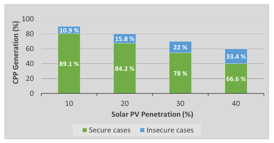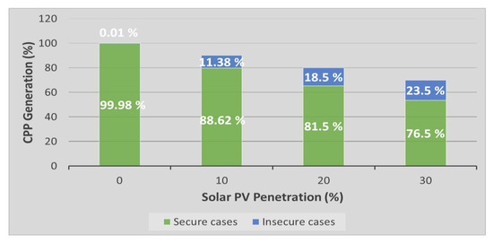 As installed capacity of variable generation increases with solar PV-driven displacement of synchronous machines in power grid, total rotational inertia and primary frequency reserves (PFR) which are essential to stabilize grid frequency reduces. This reduction in system inertia and PFR could lead to significant instability issues in large grids with high levels of PV generation or low-inertia grids such as islands like Hawaii [32], Puerto Rico [33], etc. In this study case, potential risk of frequency instability is analyzed in a large-scale solar PV integrated network by carrying out a number of different fault scenarios as outlined in Table 1. The parameters used for analyzing the frequency stability of the system are Rate of Change of Frequency (RoCoF), frequency nadir/zenith and time taken to reach nadir/zenith points following a fault occurred in the system. Cases where maximum RoCoF exceeds +/− 0.5 Hz/s or frequency nadir/zenith points exceeds thresholds set by grid codes are considered as insecure cases. These secure/insecure cases are then expressed as a percentage of total simulated cases which is represented in Figure 7. This figure shows that frequency stability is also affected by increase in PV penetration level as number of secure cases decreases with increasing PV levels in the system mainly due to reduction in inertial support.