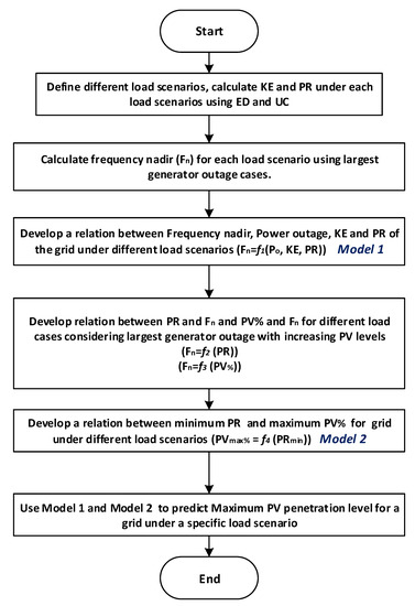 This entire procedure will give the value of maximum permissible PV penetration level that can be integrated instantaneously to the power system by ensuring secure frequency response of the system under the specified load scenario.