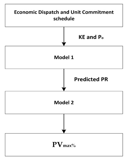 Step 4: The last step involves prediction of maximum PV penetration level at any load level of the system under consideration. Through market bidding, the system operator will be able to obtain available KE value from unit commitment and economic dispatch schedule at any load levels. Moreover, by considering a worst case scenario of largest generator outage of the system, the power imbalance is determined. At first, model 1 (Equation (6)) is used and the value of PR is calculated considering under frequency load shedding (UFLS) limit for Fn. Then this value of PR is used as input in model 2 to generate as output. Figure 9 indicates an input-output diagram of this approach.
