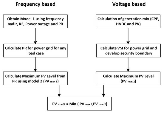 Stage 1 and stage 2 of the proposed PVmax% estimation tool are decoupled since they both depend on two different deterministic parameters such as and VSI. Figure 10 represents the flowchart of the combined estimation process which uses both the strategies together to compute maximum PV penetration level in the power grid that ensures both frequency and voltage security of the system.