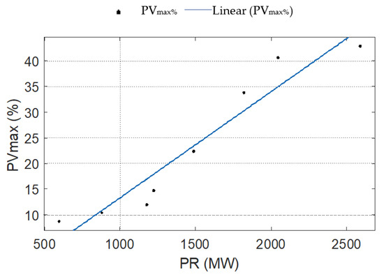 The regression model gave a fit of 92.8%, hence proving that minimum PR and maximum PV penetration level in a system are highly correlated with each other. Figure 11 depicts a plot between and showing the dependency of both parameters with each other.