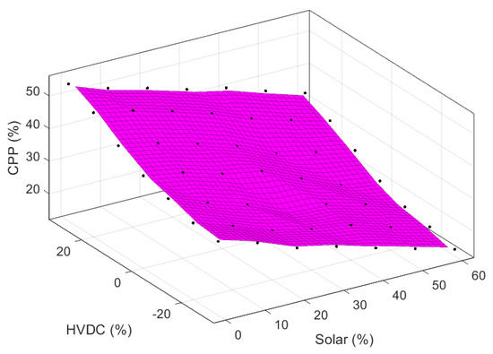 A vast range of operating conditions involving a generation mix of CPP, PV and HVDC and various fault cases as listed in Table 1 were considered to predict the security margin of the test system. The dynamic voltage security criterion explained in Section 3.2 is used to obtain the security boundary shown in Figure 12 which illustrates the influence of CPPs on voltage security of the system for various fault conditions by dividing the entire operating conditions in upper zone of insecure cases and lower secure zone. In the figure, the x and y axes represent the power share from PV and HVDC calculated with respect to the total system demand, respectively, whereas the z axis represents the power generation share from CPP in MW with respect to the total installed capacity of all CPPs present in the system. As expected, the test system is secure with more CPPs at lower PV share characterized by higher security margin.
