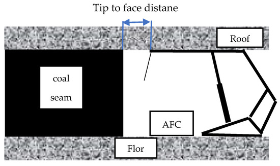 The tip to face distance is defined as the distance from the end of the canopy of the shield support to the longwall face (Figure 1). This distance is defined in the mining technology and is most often a direct result of the technological conditions: the roof support design, the width of the AFC, and the width of the shearer’s drums. Efforts are made to keep this distance as small as possible: most often, it is about 500 mm. This distance increases after the shearer has passed by the thickness of the cut. In practice, the tip to face distance increases during rockfall.