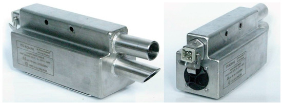 The tip to face sensor SSMS-S (Figure 2) was developed in the PRASS III project and is part of the SSMS system that monitors the operational parameters of longwall roof support [16]. The sensor uses an ultrasonic distance measuring technology. The issues related to the development of the sensor, the selection of the measuring technology, and testing the ultrasonic transducers are described in detail in [17].