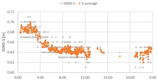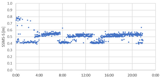 The above figures show that the sensors for some time misinterpreted the waves reflected from the transverse surfaces of the components at the end of the roof support as echo reflected from the longwall. In order to filter out erroneous data, the author’s algorithm was used to identify the correct wave reflected from the longwall face (Figure 13). The use of the author’s algorithm at this step was aimed at eliminating the blunders resulting from the fact of incorrect interpretation of the reflected wave, as well as from dirty sensors. In the algorithm used by the authors, data related to the geometry of the section, as well as those resulting from the place and method of installation (e.g., at a certain angle) are used for pre-filtering of the data.