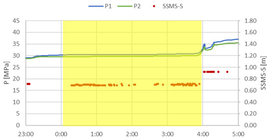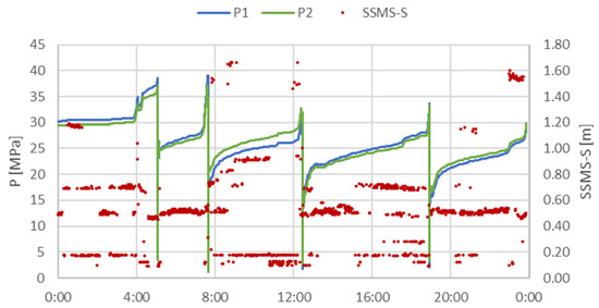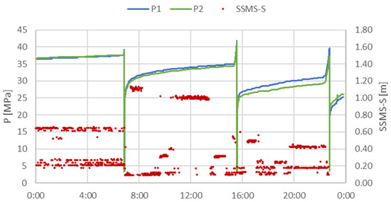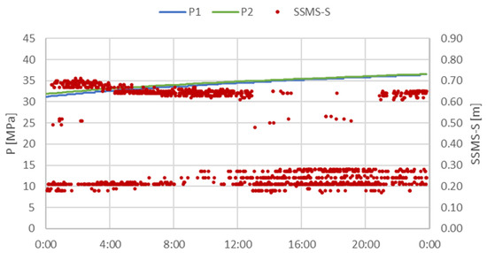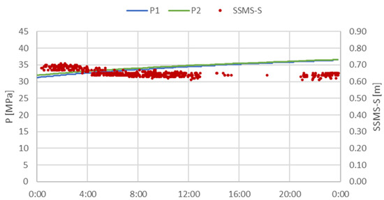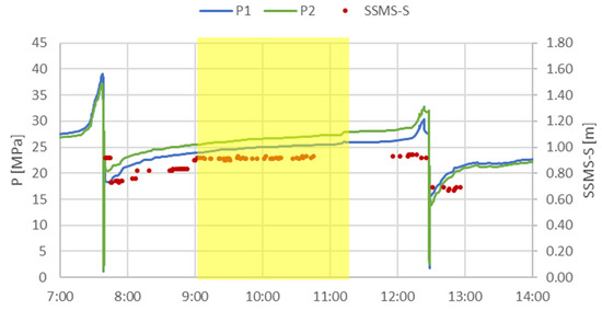 In order to assess the quality of the collected measurements and to analyse the accuracy of the measuring equipment, developed at KOMAG, data from the days when there was no mining activity were selected for further statistical analyses. On these days, pressure in the hydraulic system increased due to an increase in the rock mass pressure, as presented in Figure 12.