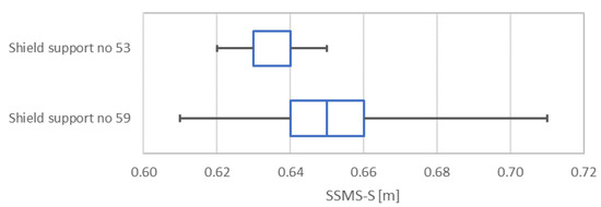 Figure 20 shows a box-and-whisker plot. It contains information on the position, dispersion, and shape of the distribution of the analysed data, thetip-to-face distance, over a selected period of time during mining when the shield support did not change its position. Central tendency (median) and scatter statistics (quartiles, min-max values) were calculated for each case group and are presented in Table 2.