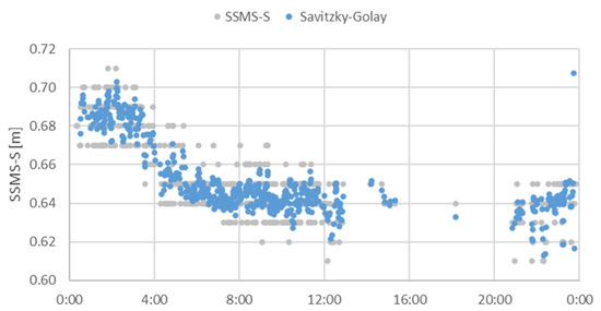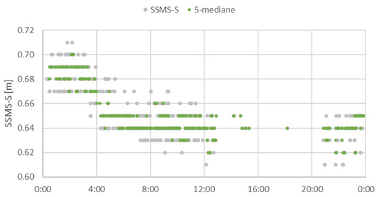 In the next step, signal smoothing methods used to compensate for periodic disturbances were analysed. Savitzky–Golay smoothing and moving average and median methods were used to smooth the data and eliminate erroneous data (Figure 15, Figure 16 and Figure 17) [22,23,24].