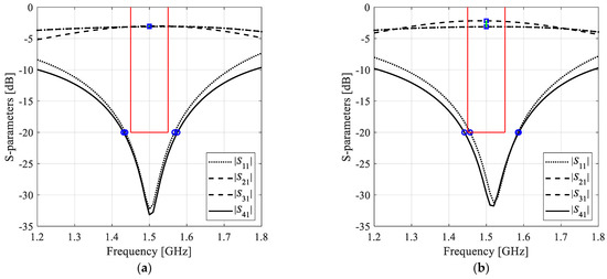Scattering parameters of an exemplary microwave coupler along with the response features corresponding to –20 dB level of matching (|S11|) and isolation (|S41|) characteristics (o) and transmission (|S21|, |S31|) at the target operating frequency of 1.5 GHz (□). The feature points allow for determining satisfaction of the performance requirements (here, the matching/isolation bandwidth of 1.45 GHz to 1.55 GHz, and maximum power split error of 0.5 dB at 1.5 GHz): (a) design satisfying specifications, (b) design violating both bandwidth and power split requirements.